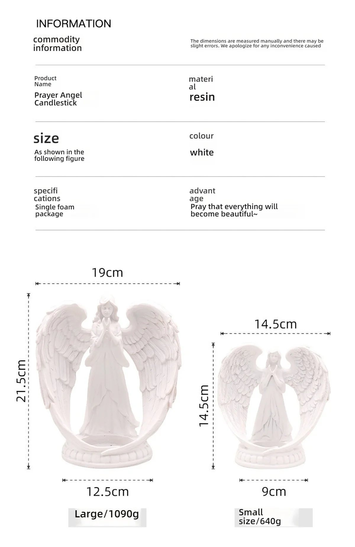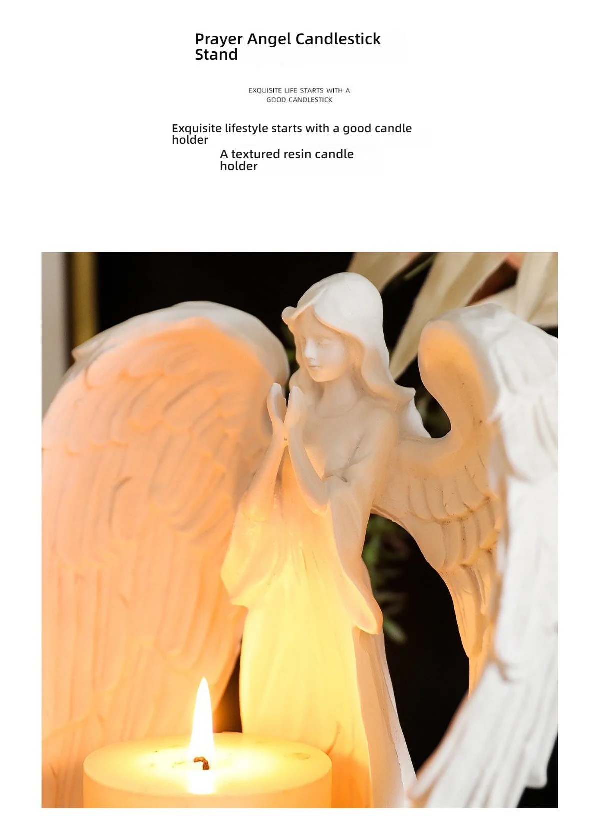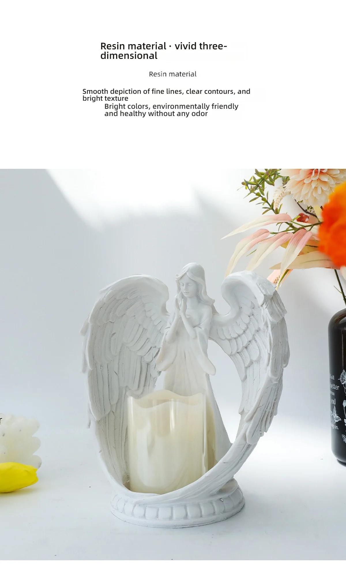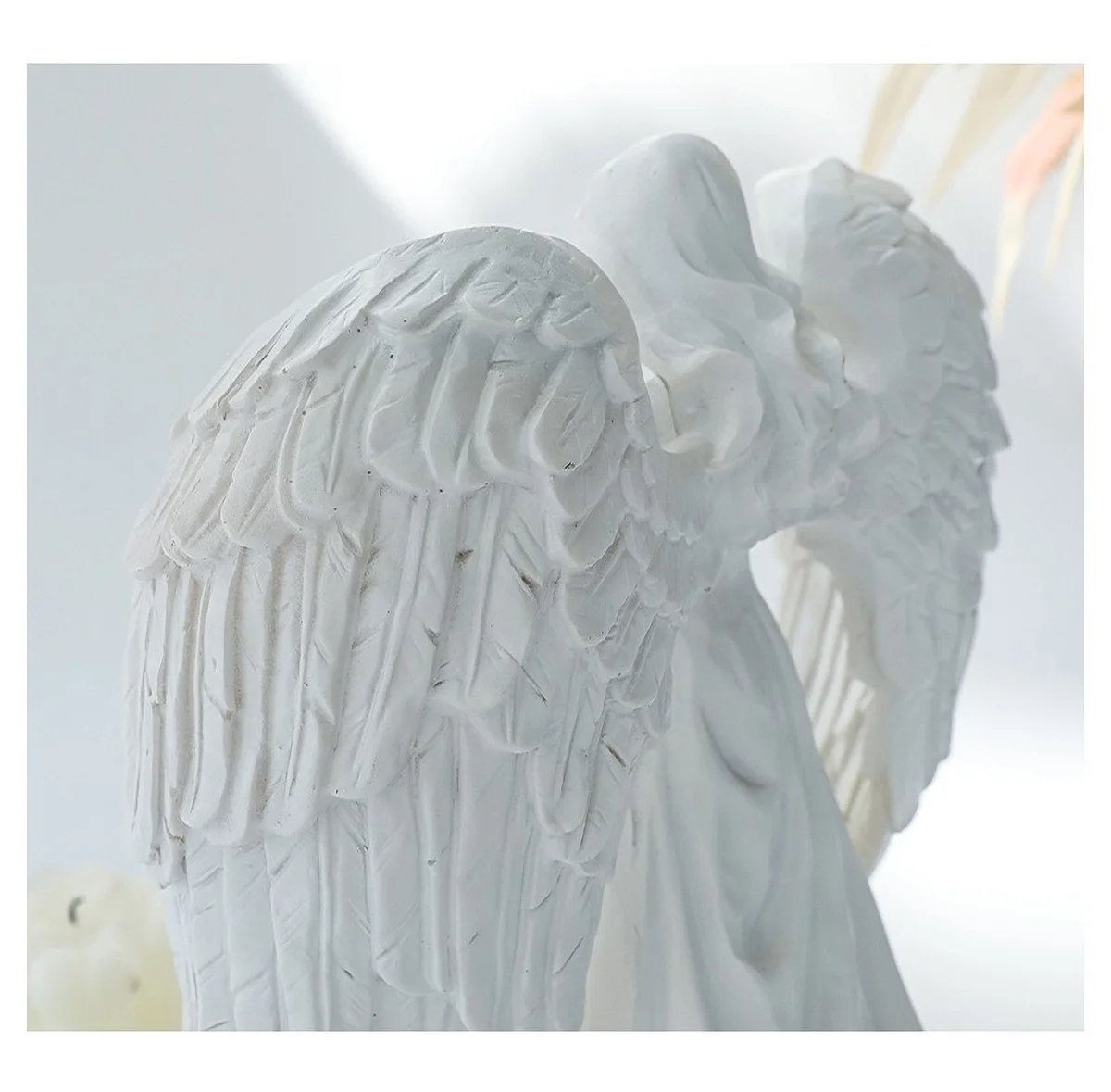 Design & Detail: A finely detailed sculpture, often cast in resin with a matte white or stone-like finish, depicting an angel or a pair of large, protective wings curved around a central space designed to hold a tea light or small votive candle. The textured, feathery detail on the wings enhances the sense of spiritual weight and grace.
