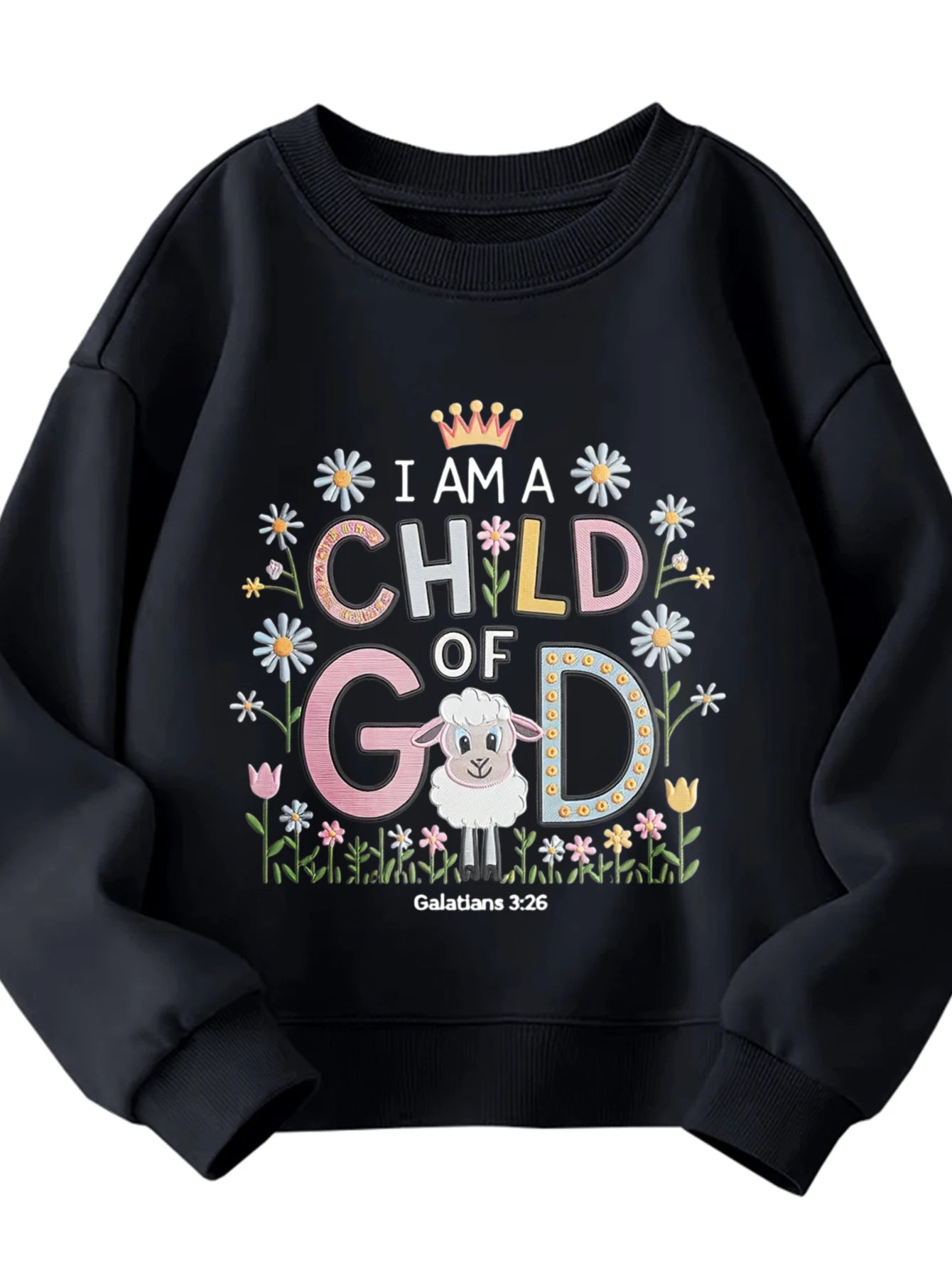 This delightful children's crewneck sweatshirt is a cozy and stylish way for kids to proudly wear their faith. Featuring the uplifting message "CHILD OF GOD" surrounded by a colorful, embroidered floral and heart design, this piece is perfect for everyday wear.
