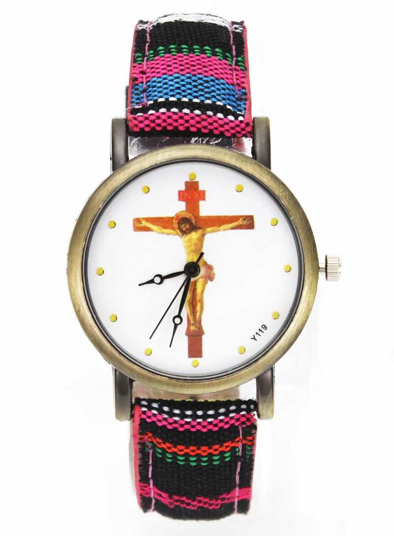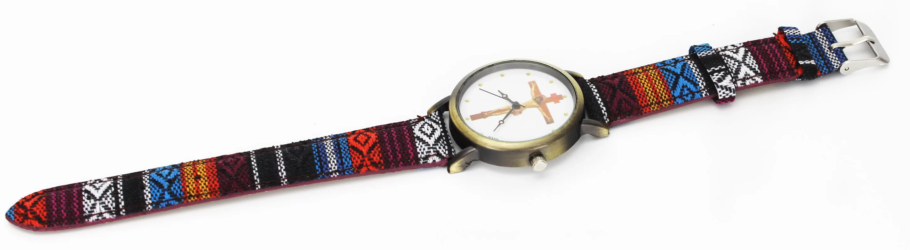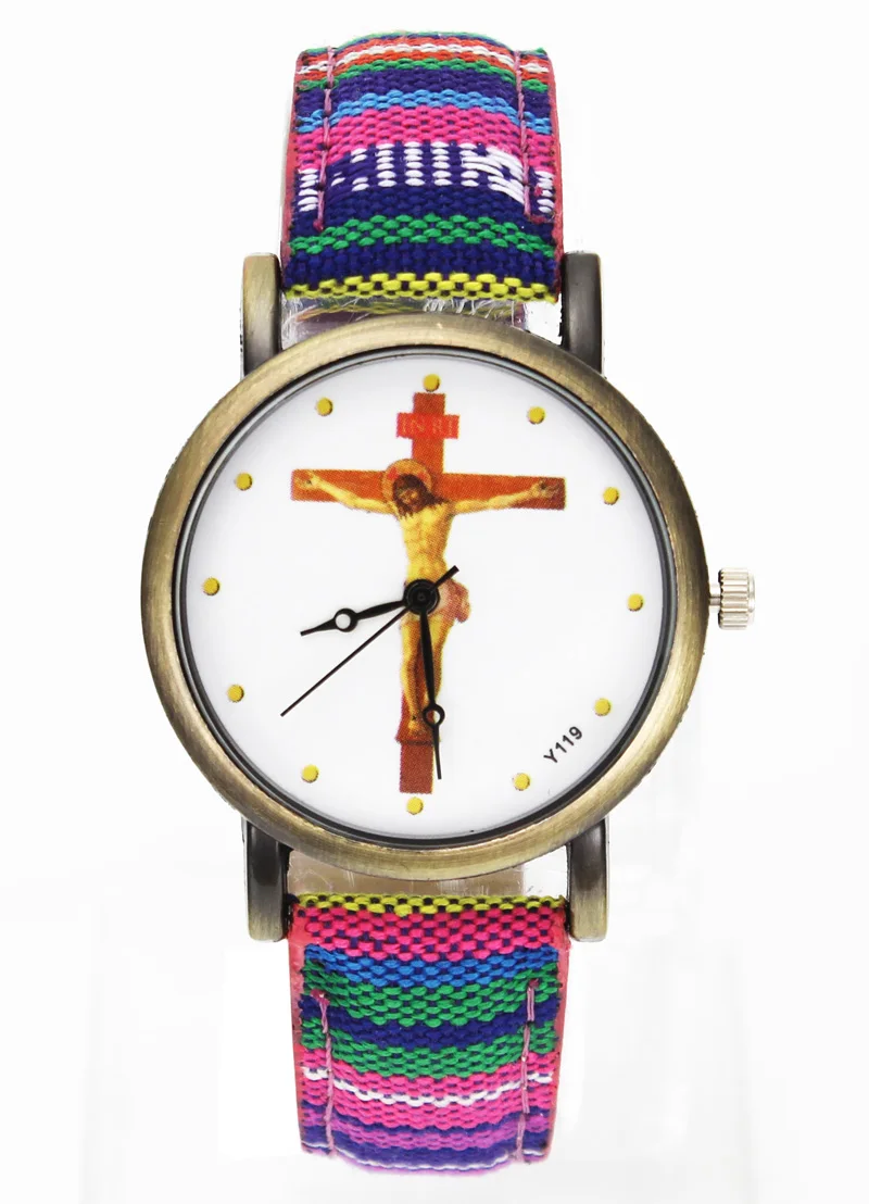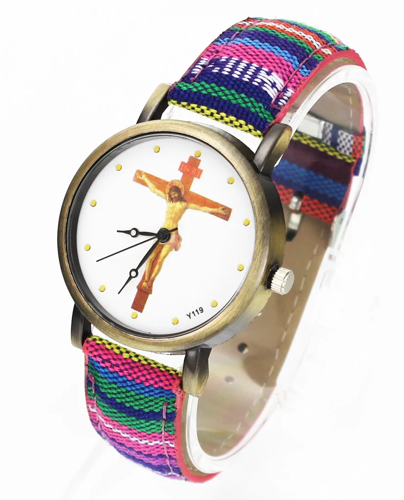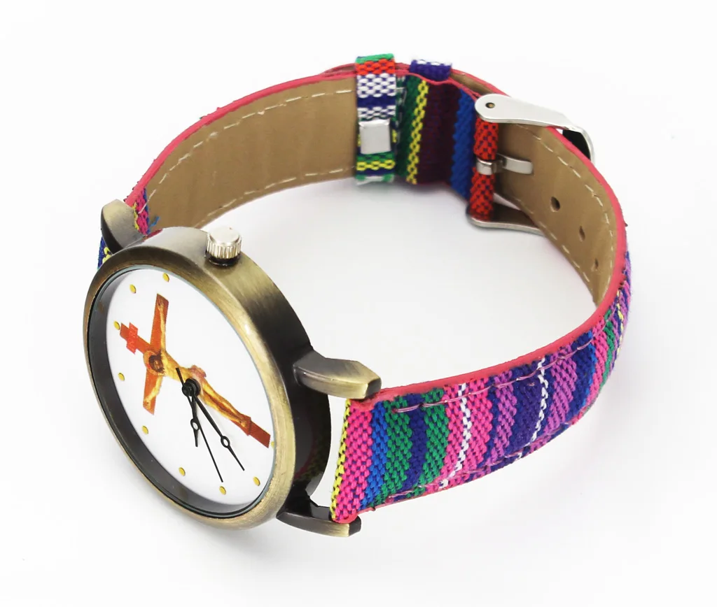 Design & Detail: A functional wristwatch with a round metal casing (often antique or bronze-tone) and a clear, white dial that serves as a backdrop for the classic image of the Corpus on the Cross. The defining element is the soft, patterned, woven fabric strap, available in various cheerful and colorful combinations (e.g., stripes, geometric, or ethnic-inspired patterns).