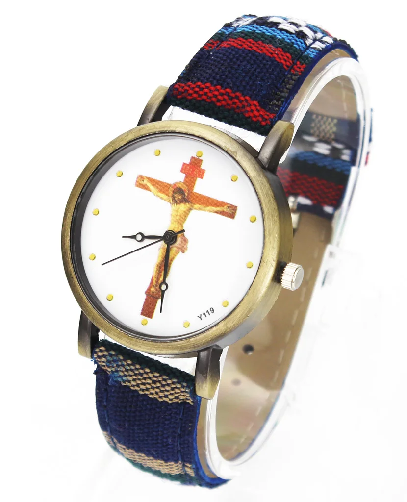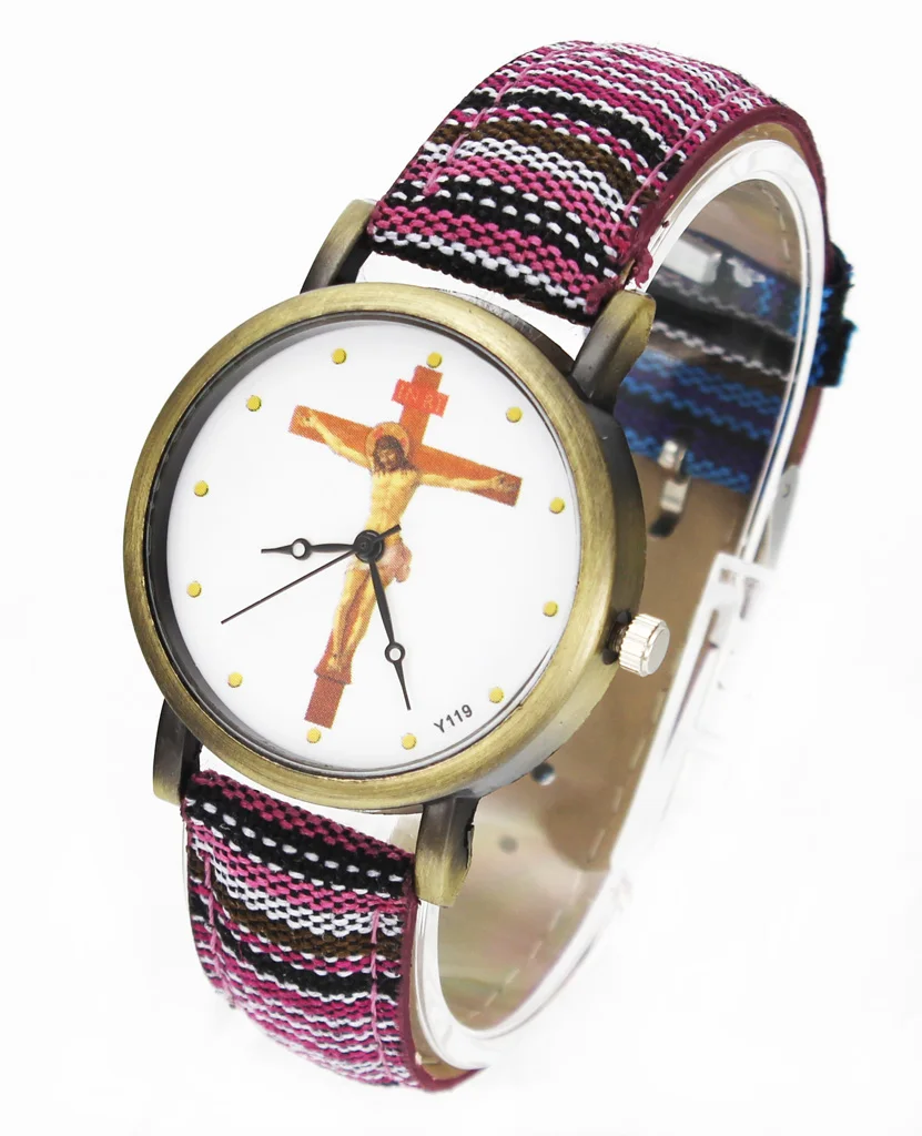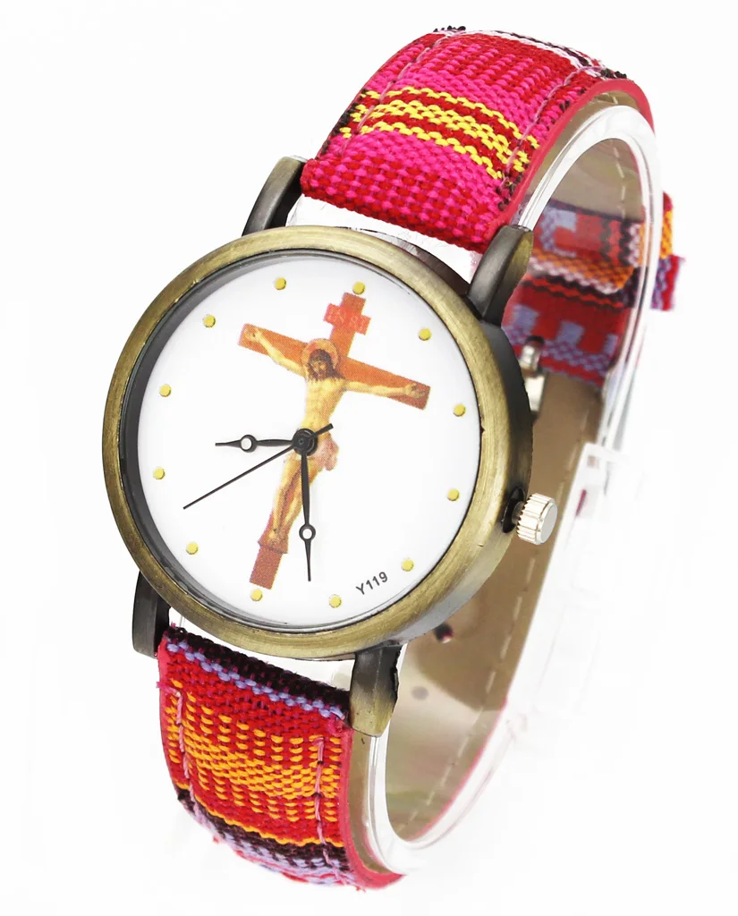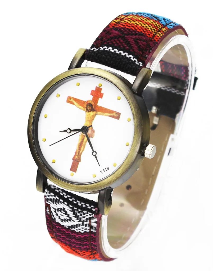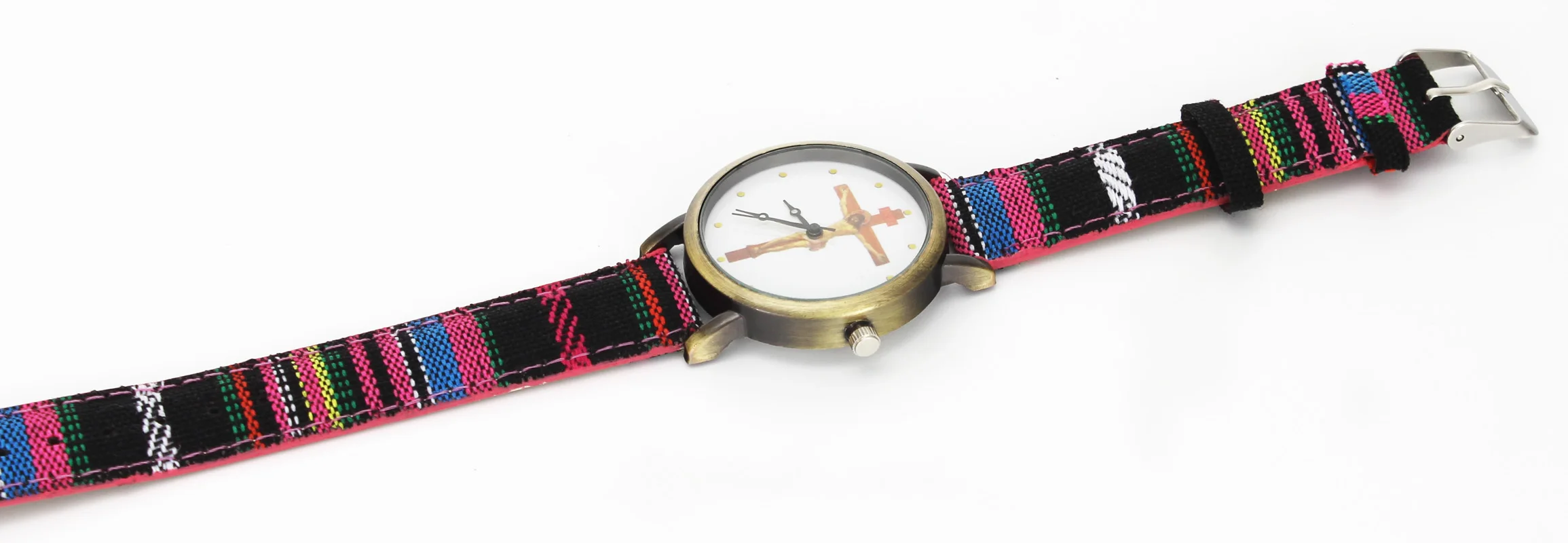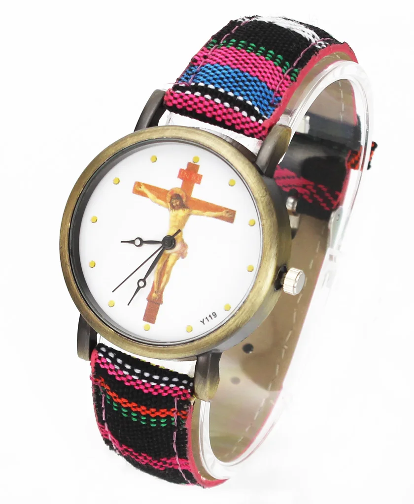 Design & Detail: A functional wristwatch with a round metal casing (often antique or bronze-tone) and a clear, white dial that serves as a backdrop for the classic image of the Corpus on the Cross. The defining element is the soft, patterned, woven fabric strap, available in various cheerful and colorful combinations (e.g., stripes, geometric, or ethnic-inspired patterns).