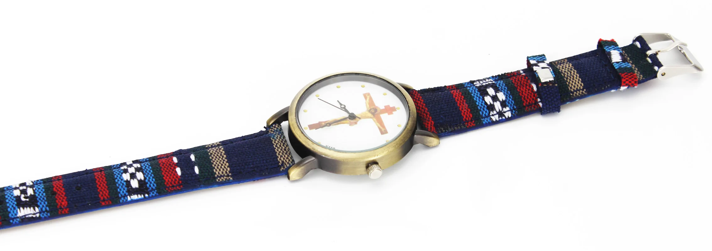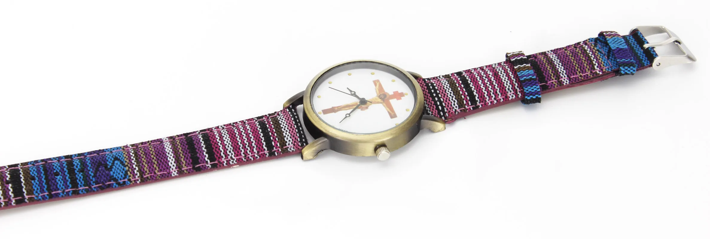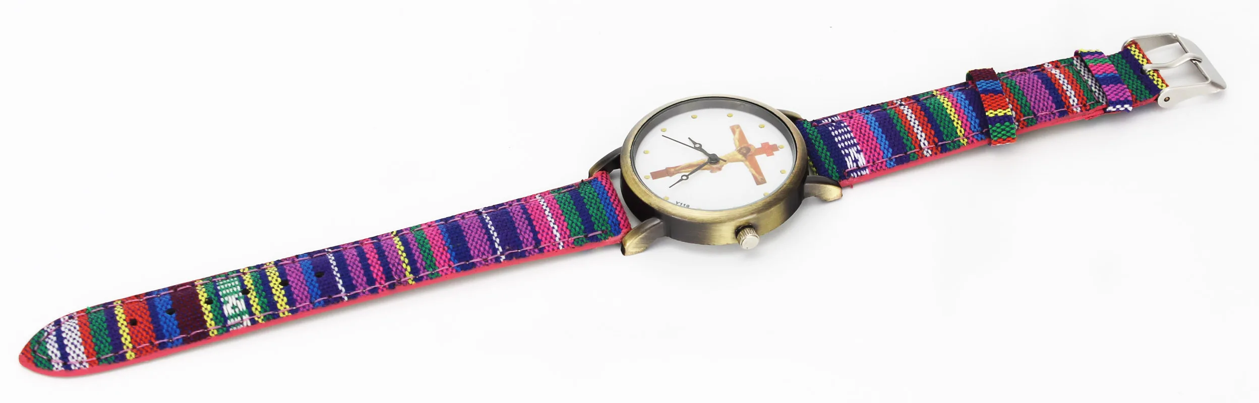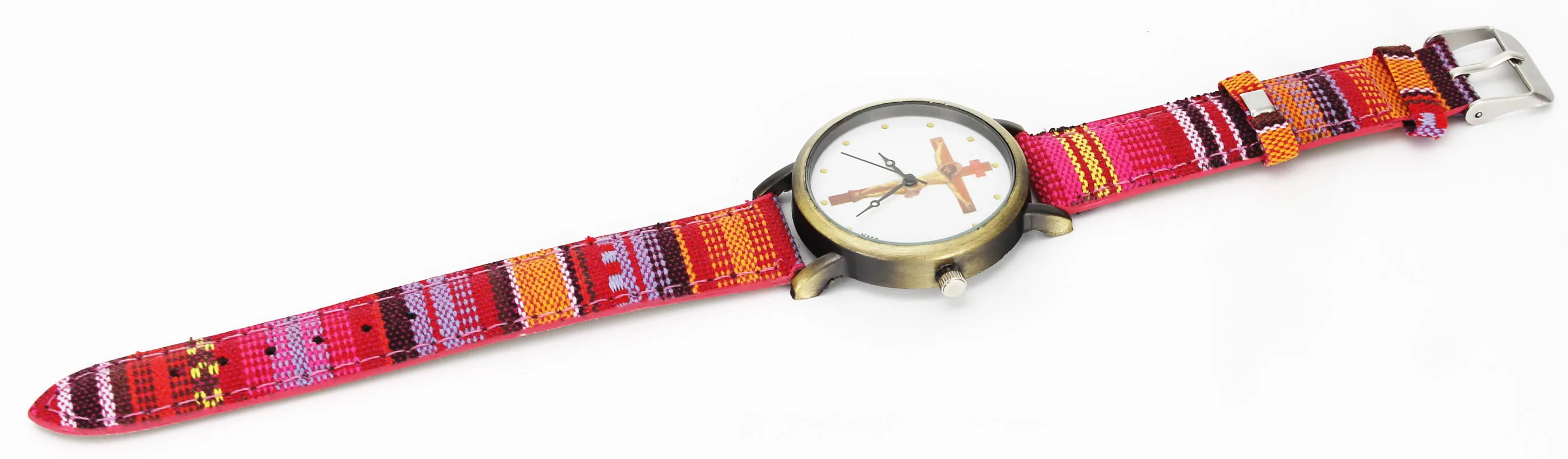 Design & Detail: A functional wristwatch with a round metal casing (often antique or bronze-tone) and a clear, white dial that serves as a backdrop for the classic image of the Corpus on the Cross. The defining element is the soft, patterned, woven fabric strap, available in various cheerful and colorful combinations (e.g., stripes, geometric, or ethnic-inspired patterns).