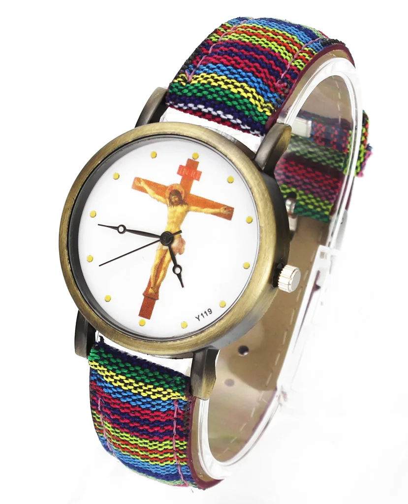 A unique Wristwatch featuring the central Christian image of the Crucifixion (Christ on the Cross) prominently displayed on the bright white watch face. This devotional core is contrasted by a vibrant, multi-colored woven or patterned fabric band that lends the timepiece a distinctive, casual, and ethnic-inspired aesthetic.