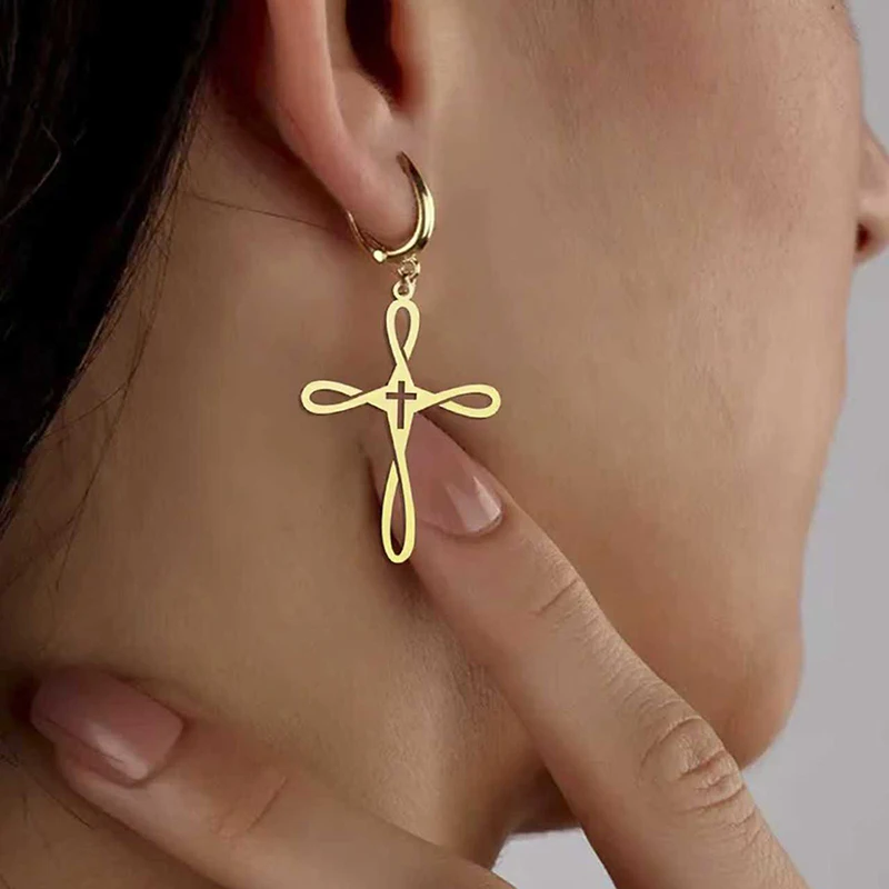 Design & Detail: The cross pendant is small and lightweight, measuring approximately 0.8 inches. Its design is an abstract, continuous loop or "ribbon" that elegantly forms the cross, symbolizing eternity and the unbroken nature of God's love. The jewelry is offered in both lustrous gold-tone and crisp silver-tone. The earrings feature the same cross design suspended from delicate hoop or lever-back closures.