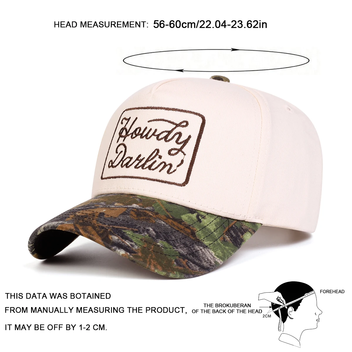 Design & Detail: A sturdy cap available in two primary configurations: a full camouflage print or a two-tone design (solid light-colored front panel/brim with a contrasting camo or solid color base). The phrase "Howdy Darlin'" is prominently featured in a stylized, rustic script within a stitched rectangular patch, emphasizing a friendly, Southern-inspired charm.
