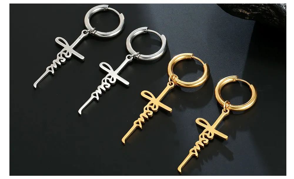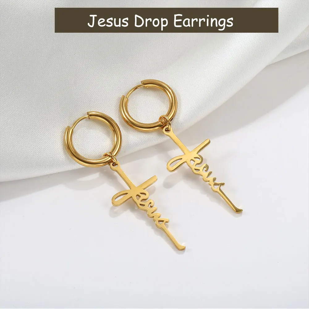 A highly contemporary and spiritual pair of dangle earrings featuring a delicate, flowing script spelling the name "Jesus," which is combined with the central form of a Latin cross. Suspended from a secure hinged hoop, this design elegantly merges the written name of Christ with the symbol of redemption. Available in both bright silver-tone and polished gold-tone finishes.