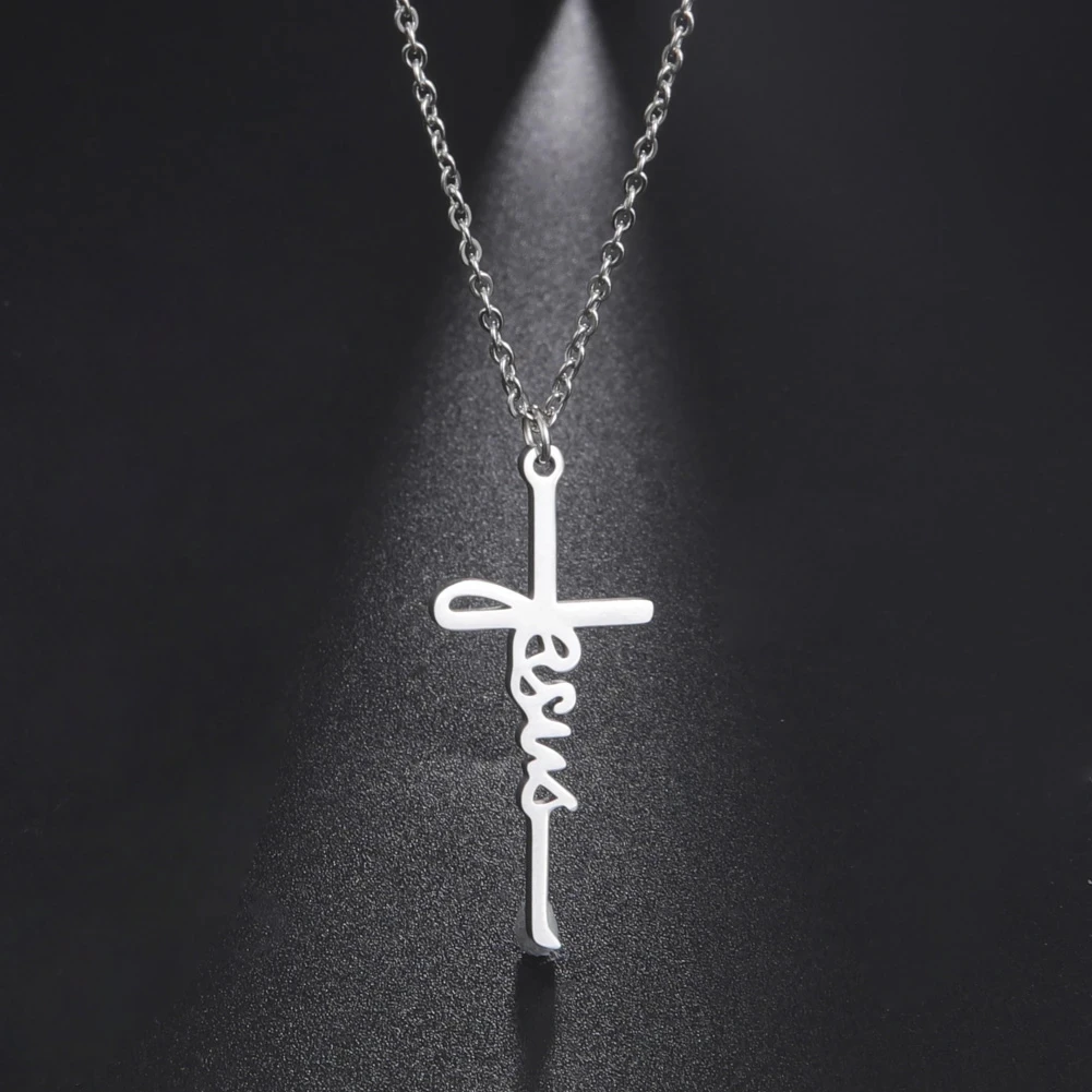 Design & Material: Made from a polished, anti-tarnish metal (likely stainless steel) in a high-quality, lasting finish. The name is rendered in a free-flowing script, where the central letter 't' or a vertical line forms the cross structure.