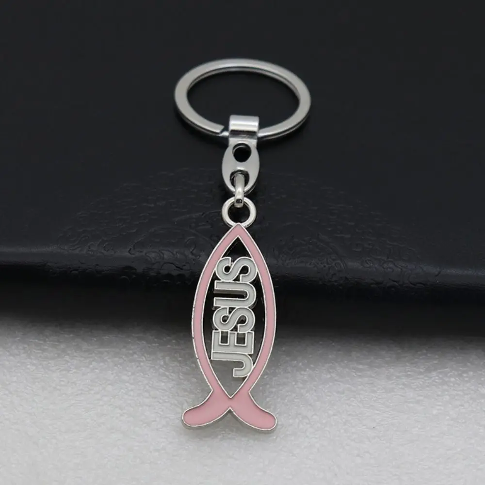 Description: A cheerful and modern collection of keyrings featuring the iconic Ichthys (Jesus Fish) symbol. The cut-out (鏤空) design prominently displays the name "JESUS" across the center. Available in vibrant enamel colors such as black, blue, red, and pink, this accessory is a bright, public, and stylish declaration of faith and salvation.