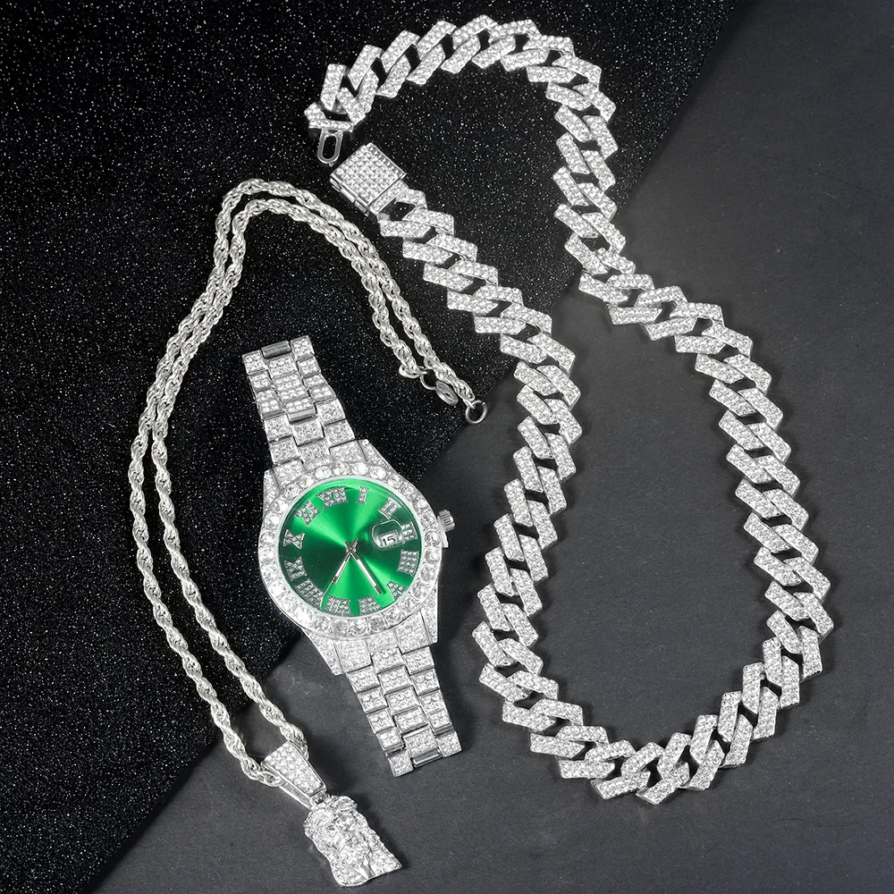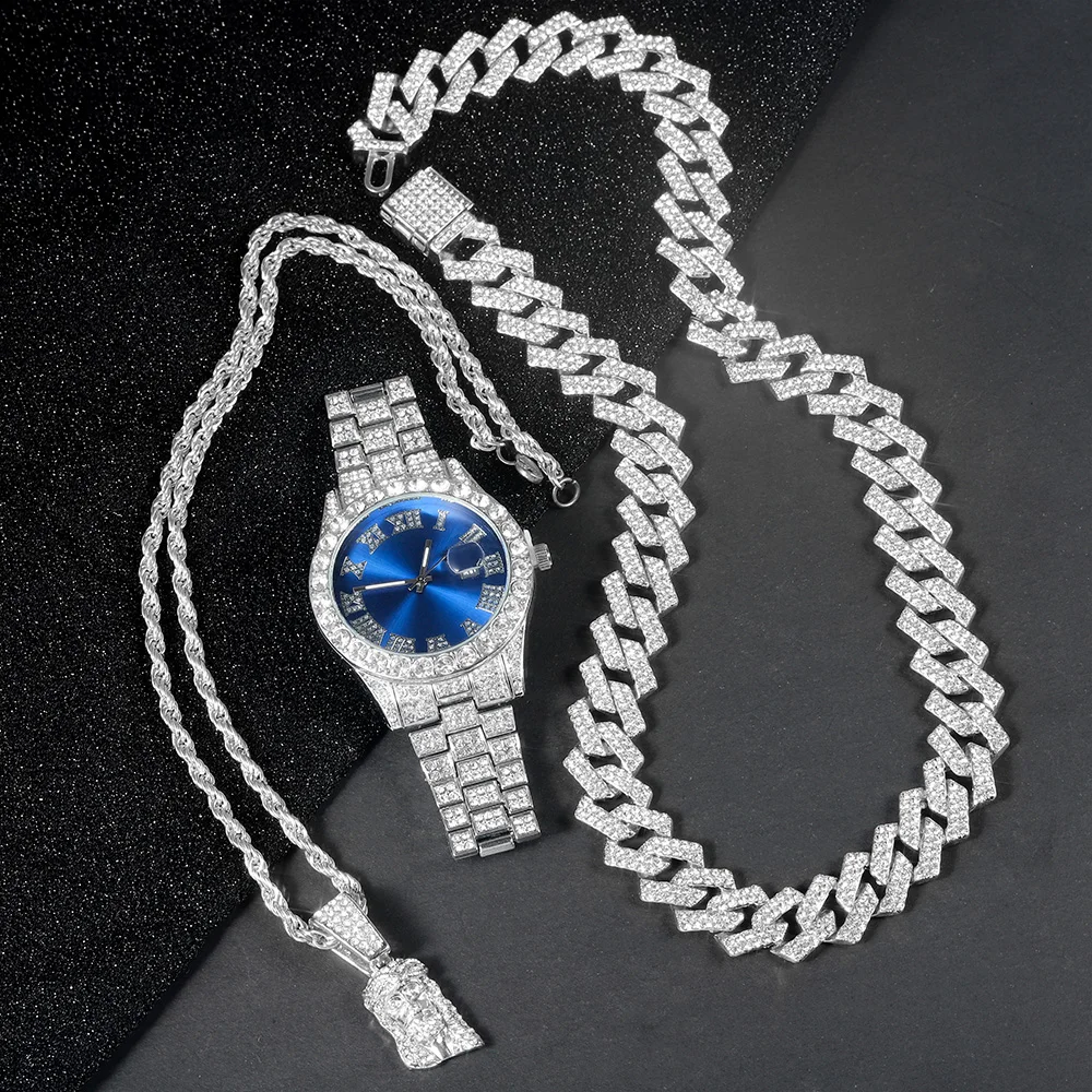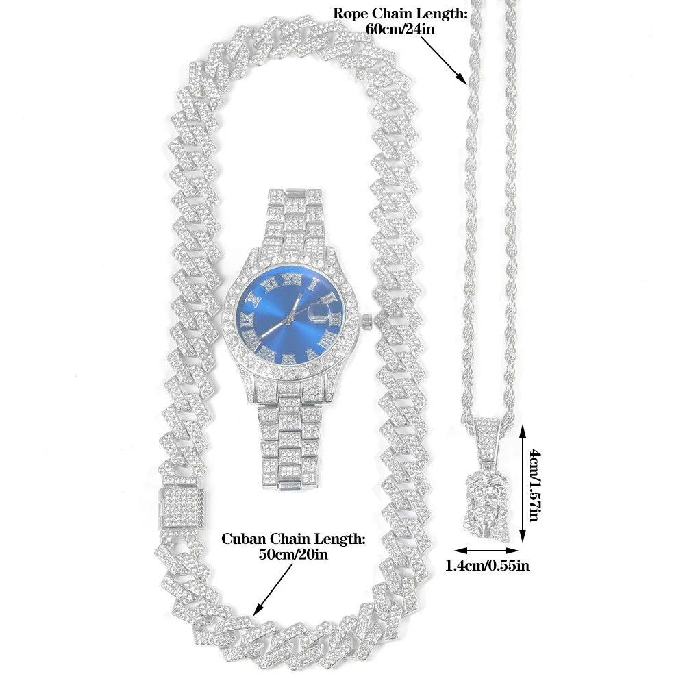 A high-impact, coordinated Jewelry Set featuring a central Jesus Head Pendant alongside a fully-iced (simulated diamond-studded) Watch and various Chain styles (such as Cuban link or rope chain). This set is designed to make a bold, glittering statement of faith, focusing on themes of Christ's glory and majesty.