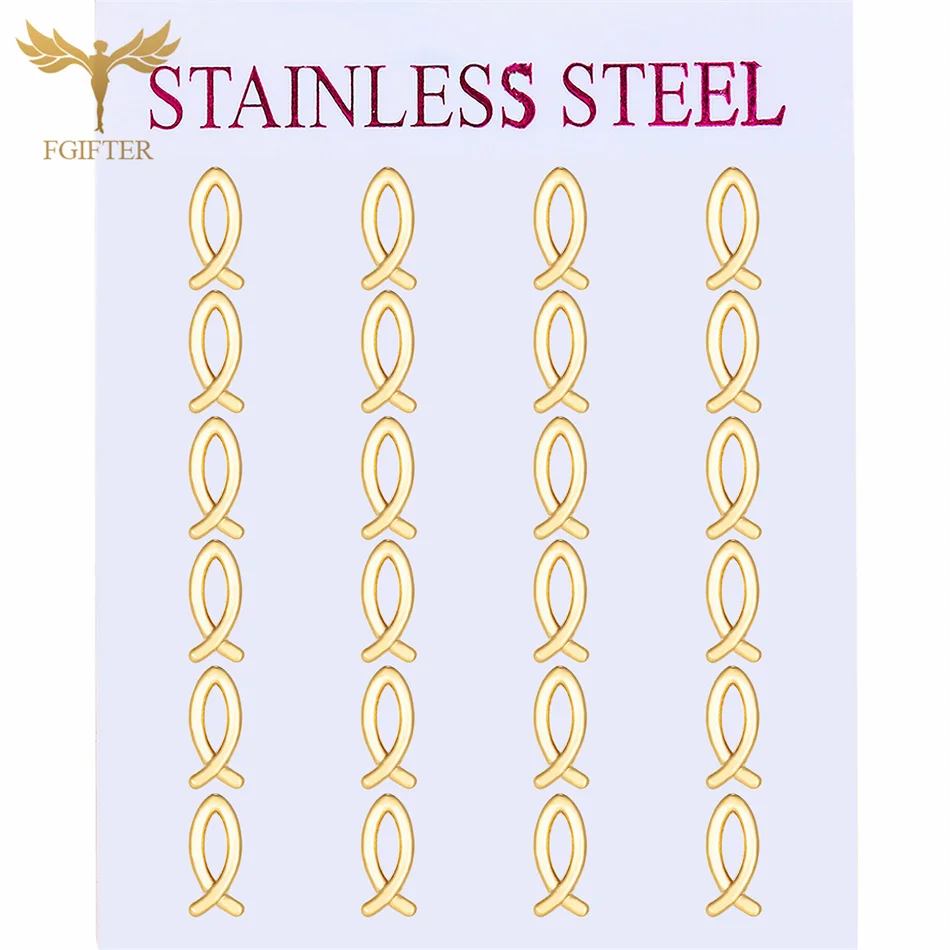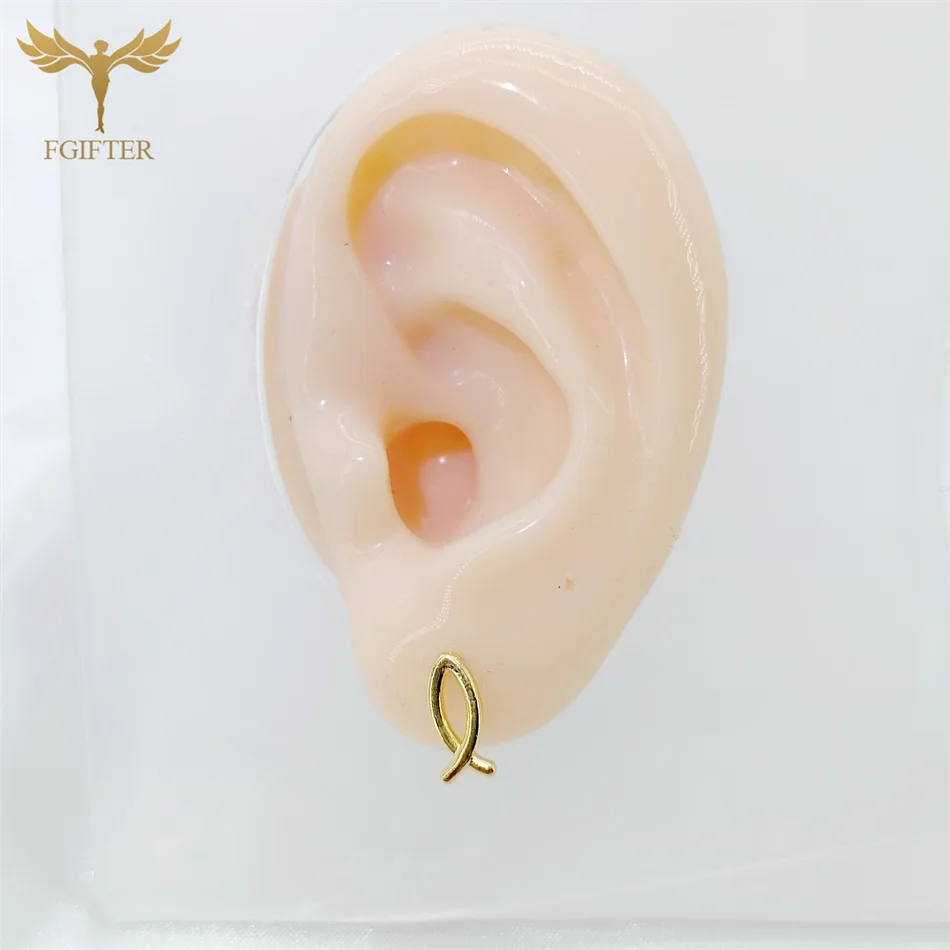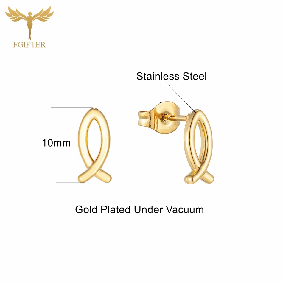 A delicate and discreet pair of stud earrings featuring the iconic Ichthys (Fish) symbol. This ancient Christian mark of identification is rendered in a simple, highly polished, minimalist outline, sitting close to the earlobe. Available in a lustrous gold-tone finish, these studs offer an elegant and subtle way to express Christian identity.