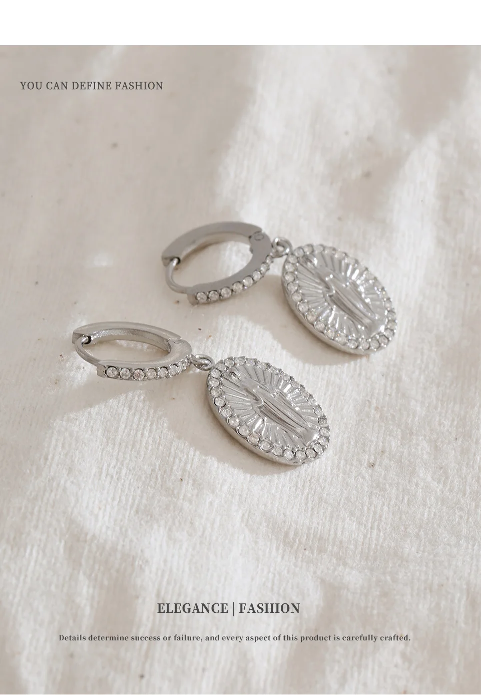 A radiant and elegant pair of dangle earrings featuring the iconic Miraculous Medal suspended from a micro-pavé crystal-studded hinged hoop. The central medal is rendered in a polished silver-tone and surrounded by a brilliant halo of small, clear stones on the border of the hoop. This design beautifully blends Marian devotion with contemporary fashion and sparkle.