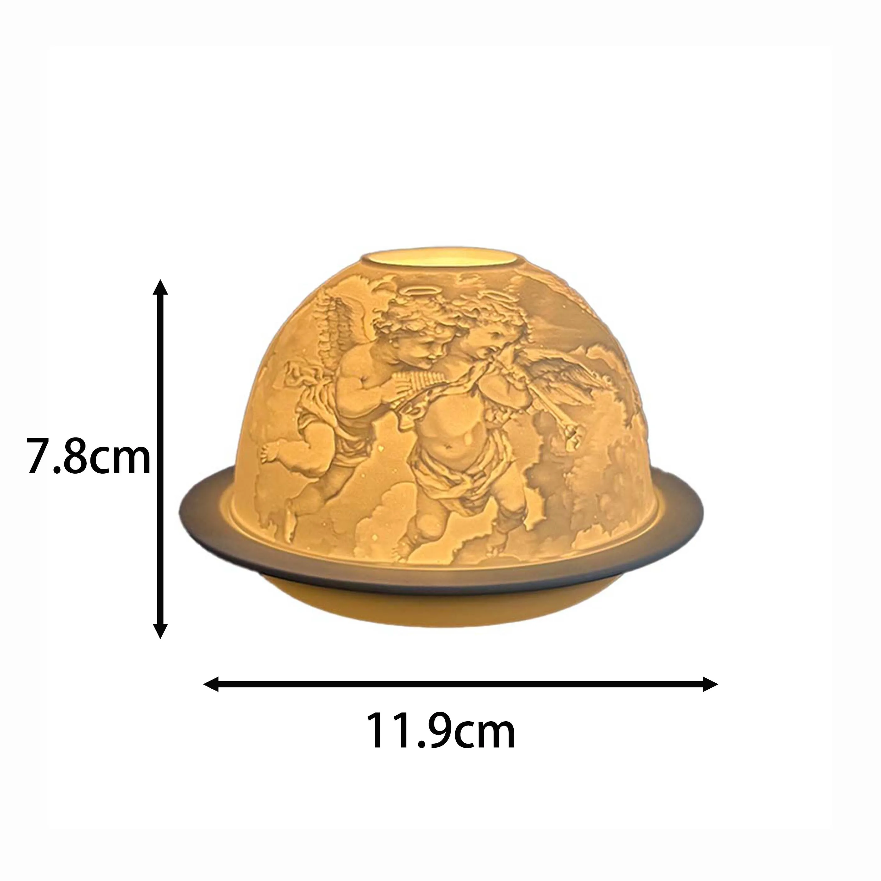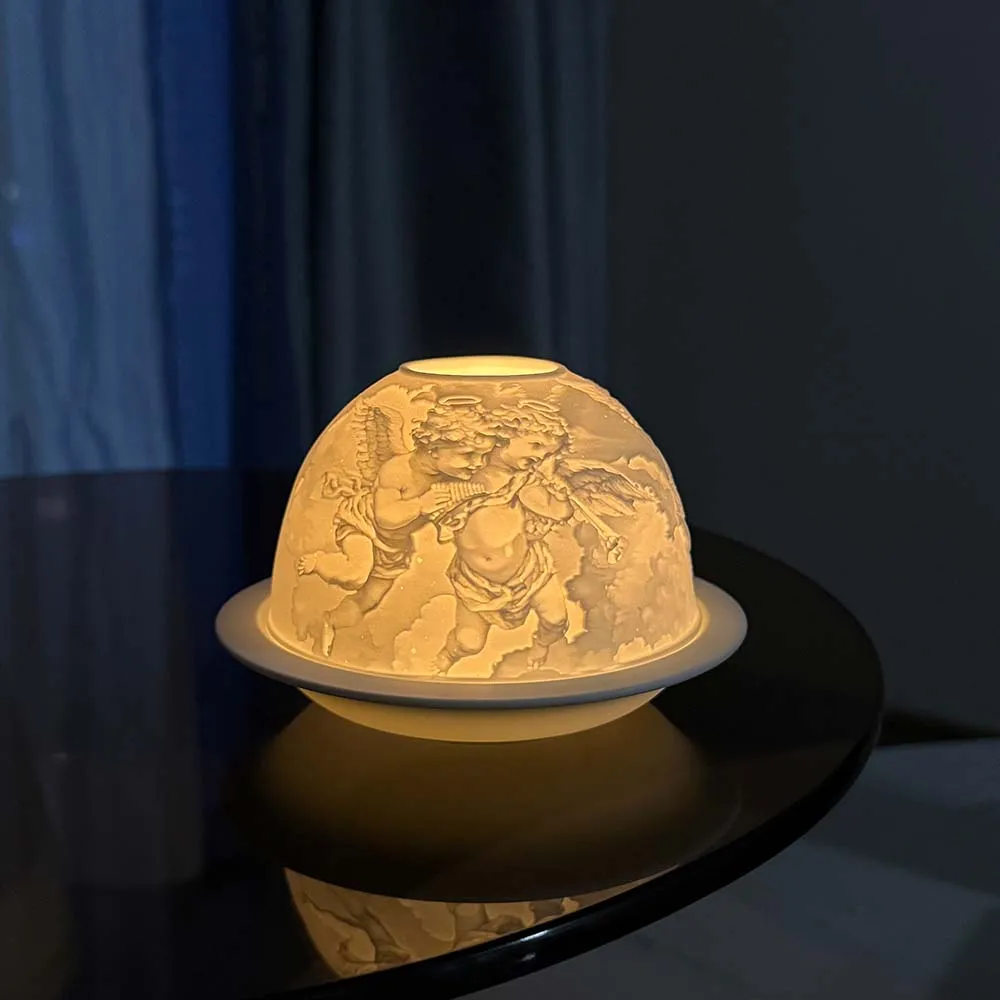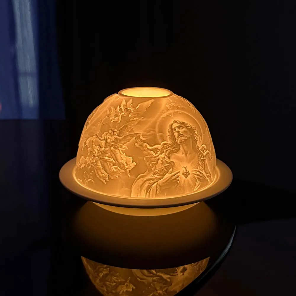 These exquisite porcelain dome candle holders transform the simple flicker of a tealight into a luminous display of sacred art. Crafted with translucent relief, the domes feature intricate scenes such as the Nativity, the Virgin Mary, and protective Angels. They serve as a perfect source of warm, spiritual ambiance, fostering peace, meditation, and a reverence for sacred moments.