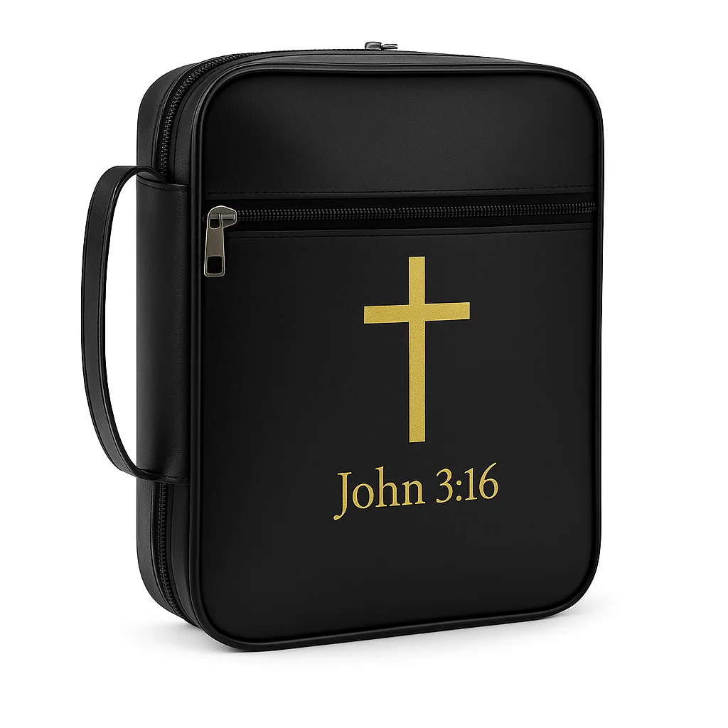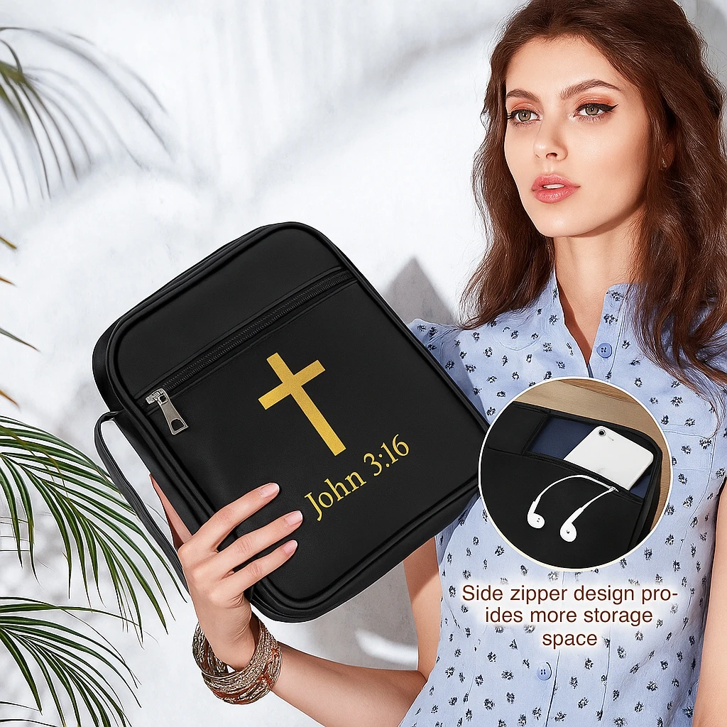 Design & Material: Made from premium, anti-wear, and water-resistant synthetic material (likely PU leather or durable canvas) in a classic black finish. Features reinforced stitching, smooth zippers, and a sturdy carrying handle. The exterior design is minimalist, featuring a gold foil or print Cross and scripture.