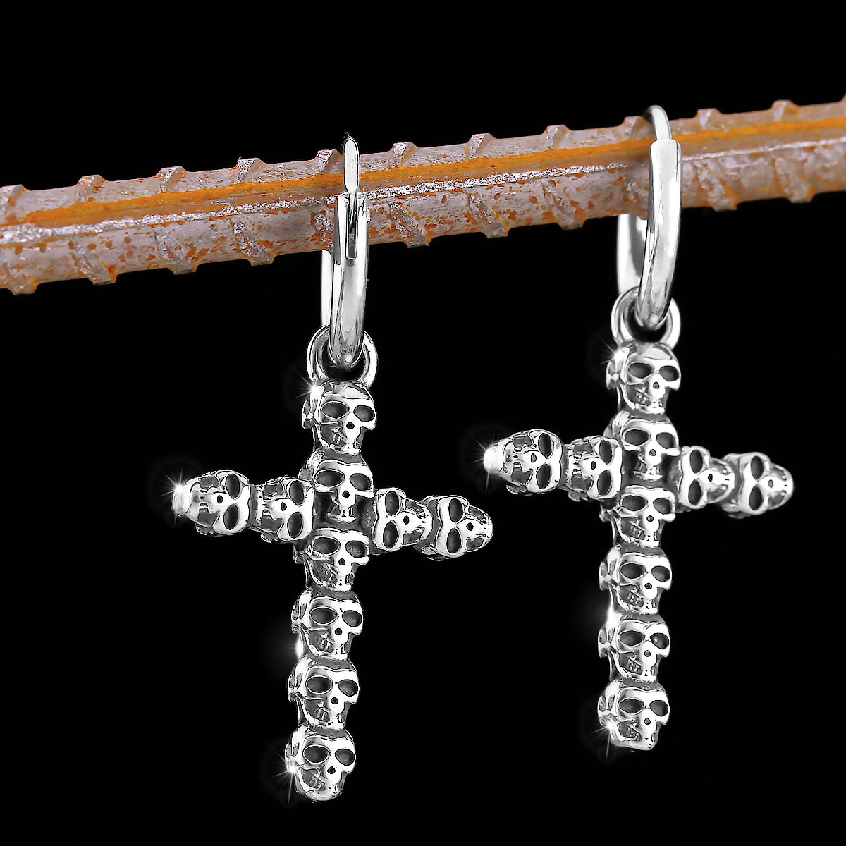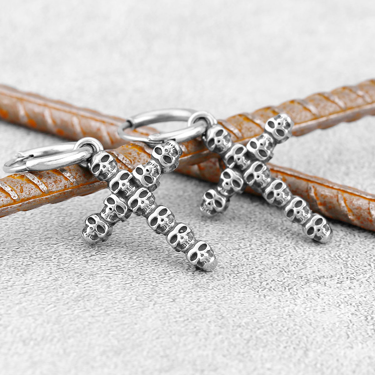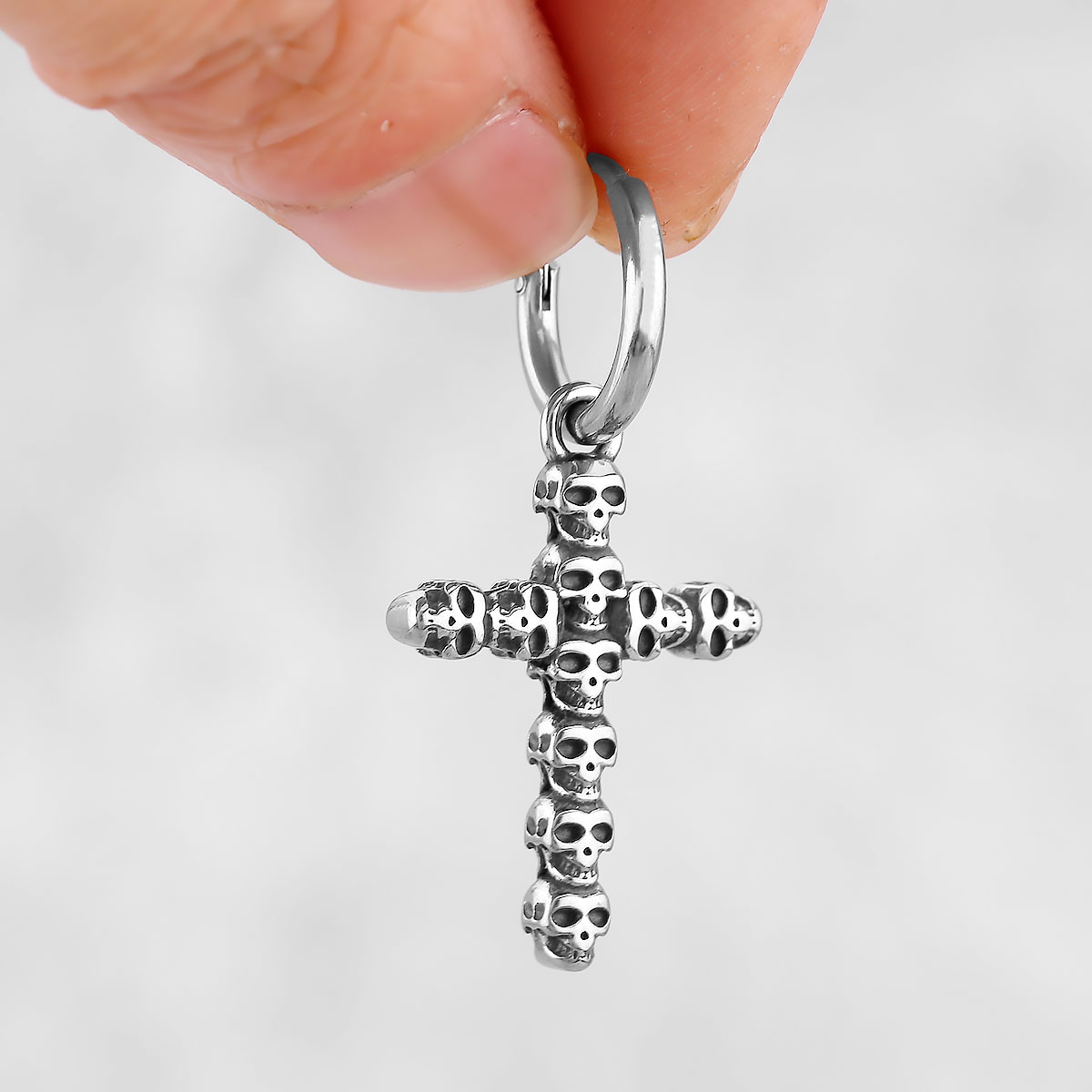 A bold and striking pair of drop hoop earrings featuring a cross pendant uniquely formed entirely by stacked skull motifs. Crafted in a polished silver-tone metal (likely stainless steel), this design is a powerful and unconventional expression of faith. The repeating skull imagery, in the Christian tradition, often serves as a Memento Mori—a contemplative reminder of mortality, the brevity of life, and the ultimate victory of Christ over death at Golgotha, "The Place of the Skull."