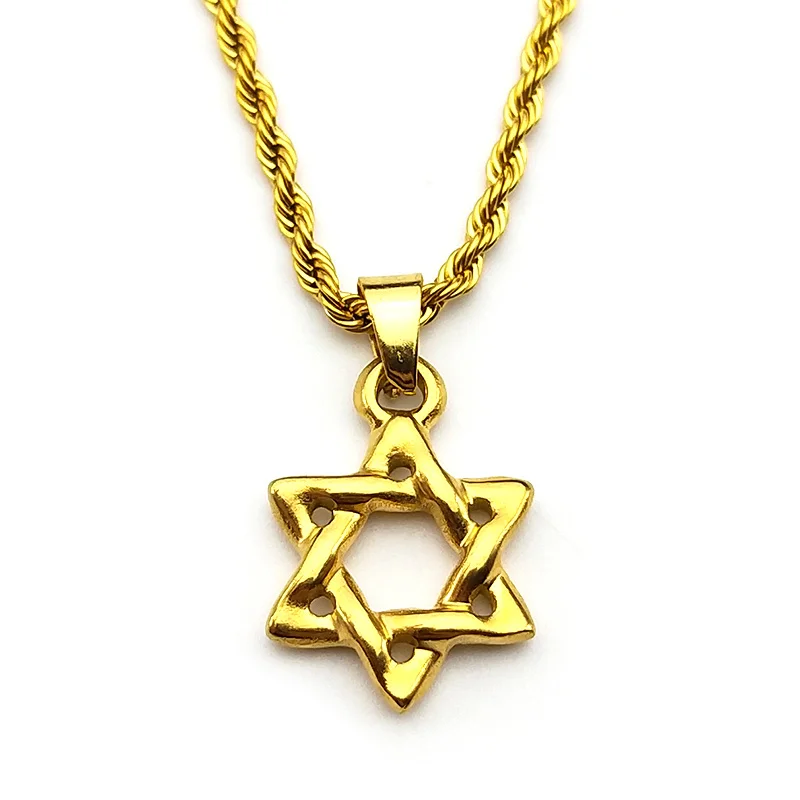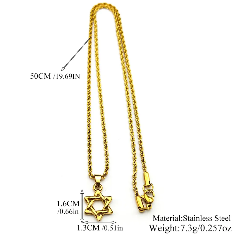 Design & Detail: A finely crafted Star of David pendant, an interlocking six-pointed star, often with a slightly textured or hammered finish for a rustic appeal. It is suspended from a classic twisted or rope chain and offered in gleaming gold-tone and polished silver-tone finishes.