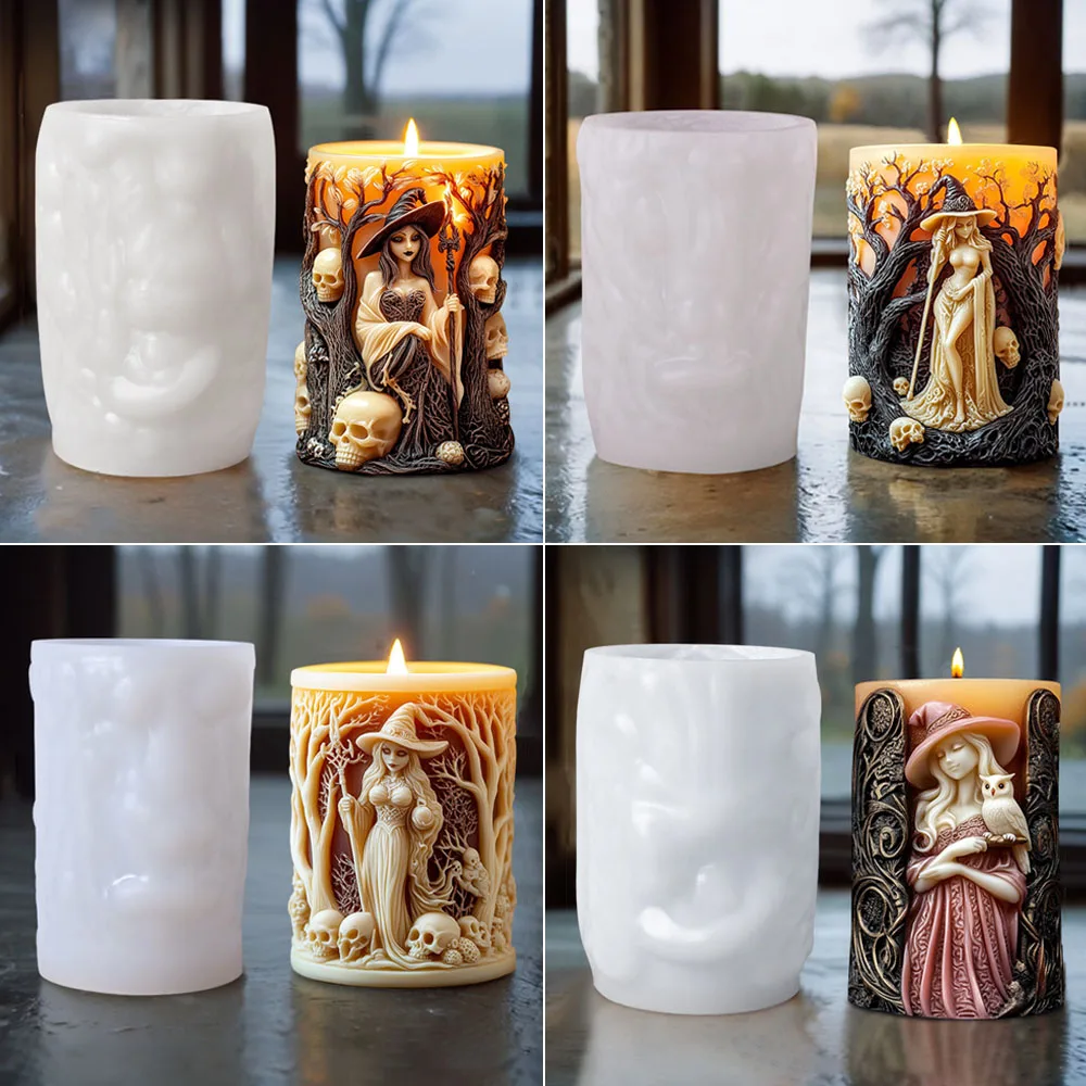 Design & Detail: A substantial pillar candle with deeply textured, sculpted surfaces, often combining a central figure (like a witch or sorceress) with surrounding symbolic elements (skulls, tangled roots, or bats). The wax is usually multi-toned (e.g., rustic orange, black, or natural white) to enhance the dramatic, aged appearance. It can be either a traditional wax candle or a safer, battery-operated LED version.